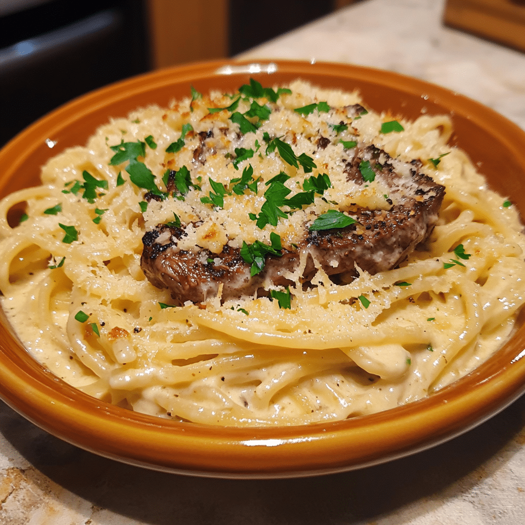 Homemade a must-try: creamy parmesan pasta and garlic steak! plated in a bright kitchen with natural daylight and vibrant food details. This A Must-Try: Creamy Parmesan Pasta and Garlic Steak! …